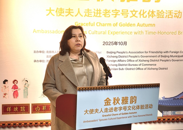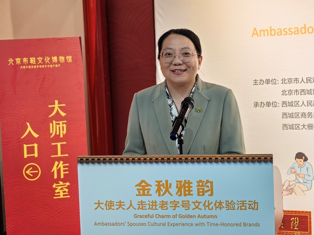 北京市人民对外友好协会一级巡视员王艳霞出席活动,她表示,北京老字号品类丰富、历史悠久、文化底蕴深厚,是“京味文化”的“金名片”,希望各位大使夫人近距离感知百年品牌,增进对中国文化和优秀国潮产品的了解。
