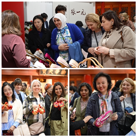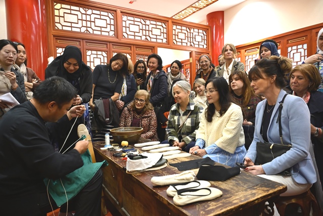 走进内联升旗舰店,大使夫人们被一双双制作精良的老北京布鞋吸引了眼球,尤其是各色绣花图案深受嘉宾喜爱,根据现代消费者需求开发的新“国潮”布鞋也深受好评。夫人们参观了内联升百年发展历程展览,观摩了非遗大师现场展示“千层底布鞋制作技艺”,还参观了张一元、天蕙斋等非遗技艺和特色产品。