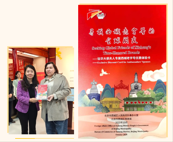 本次活动是对西城区老字号企业的一次集中展示推介,西城区还精选了全聚德、一得阁、祥义号等十家与日常生活相关有代表性的老字号品牌,制作了专属体验卡,向夫人们推介最优质的国货产品。活动中,西城区副区长郭洁向大使夫人团赠送了体验卡。
