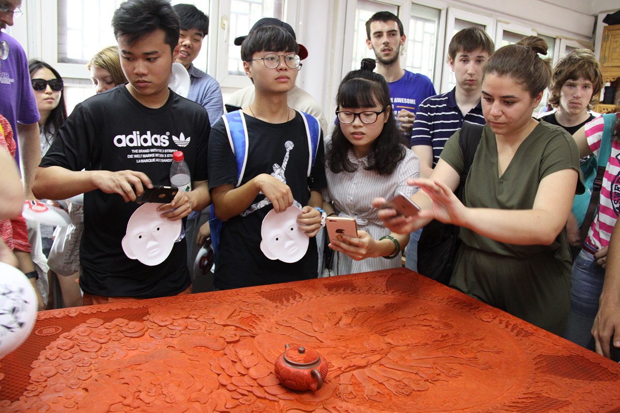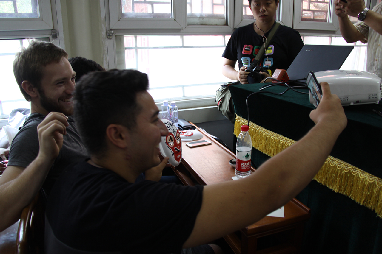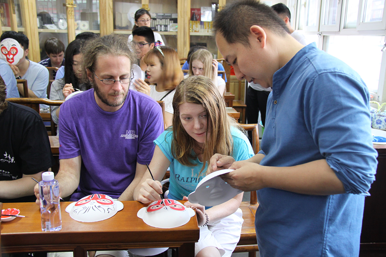 尽管天气非常炎热,国际留学生却兴趣盎然,不停用手机、相机拍摄非遗传承人的精彩作品,并在非遗传承人的指导下,亲手绘制了具有北京特色的京剧脸谱,了解了宣南地区的历史和变革。